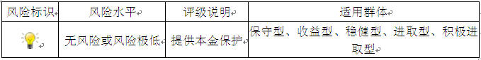 本期产品为保本浮动收益型理财产品,本理财产品有投资风险,只保障理财资金本金,不保证理财收益,您应当充分认识投资风险,谨慎投资。本期产品期限为240天(中国建设银行有权对产品进行展期或提前终止)。本期产品内部风险评级级别为一盏警示灯,风险程度属于无风险或风险极低,适用于保守型、收益型、稳健型、进取型及积极进取型投资者。最不利情况下,客户只能收回投资本金,不能获得任何投资收益。