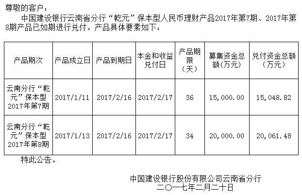 中国建设银行云南省分行“乾元”保本型人民币理财产品2017年第7期、2017年第8期兑付公告