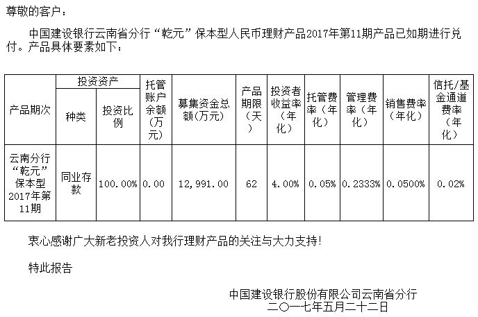 中国建设银行云南省分行“乾元”保本型人民币理财产品清算报告