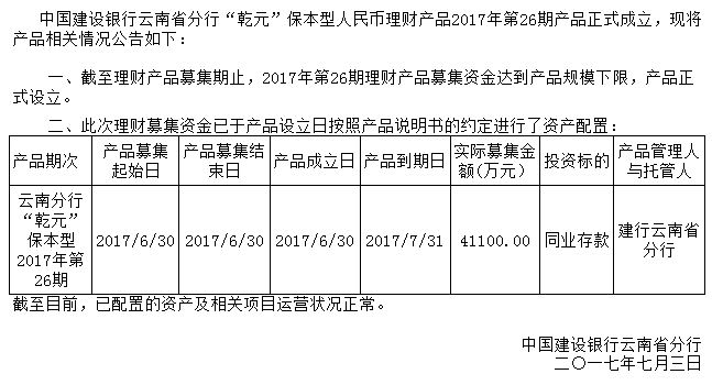 中国建设银行云南省分行“乾元”保本型人民币理财产品2017年第26期成立公告