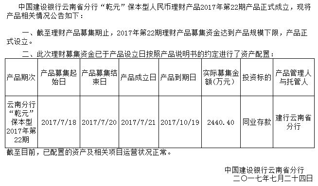 中国建设银行云南省分行“乾元”保本型人民币理财产品2017年第22期成立公告
