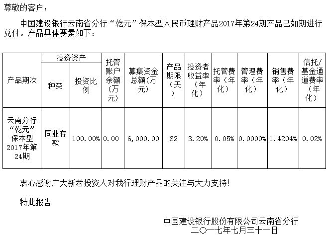 中国建设银行云南省分行“乾元”保本型人民币理财产品清算报告