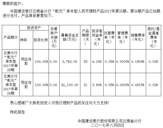 中国建设银行云南省分行“乾元”保本型人民币理财产品清算报告