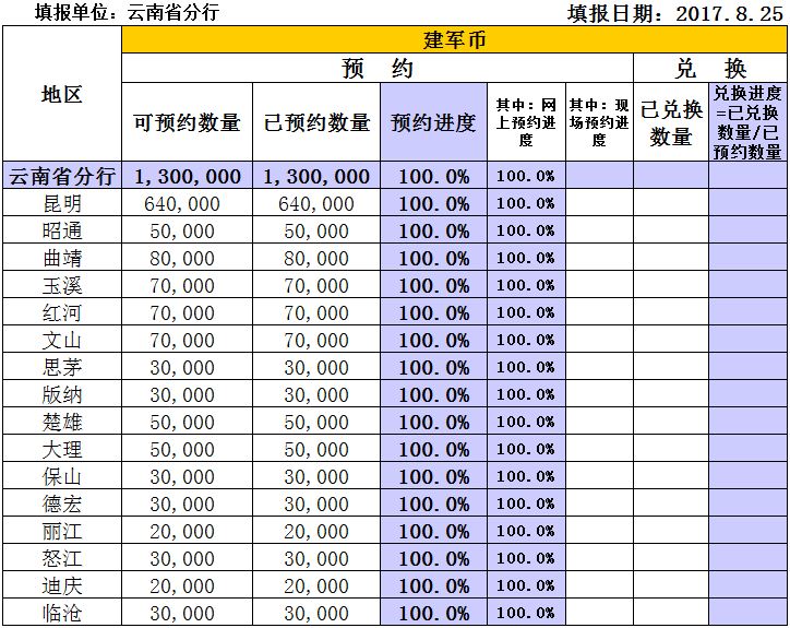 2017年建军90周年双色铜合金纪念币预约、兑换进度统计表
