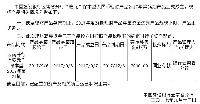 中国建设银行云南省分行“乾元”保本型人民币理财产品2017年第34期成立公告