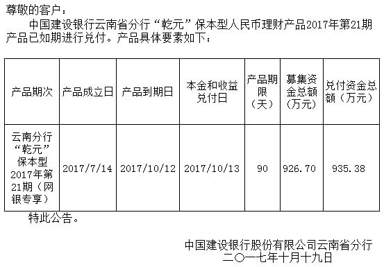 中国建设银行云南省分行“乾元”保本型人民币理财产品2017年21期兑付公告