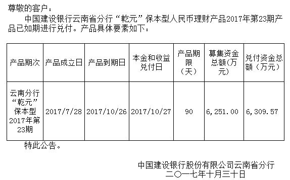 中国建设银行云南省分行“乾元”保本型人民币理财产品2017年23期兑付公告