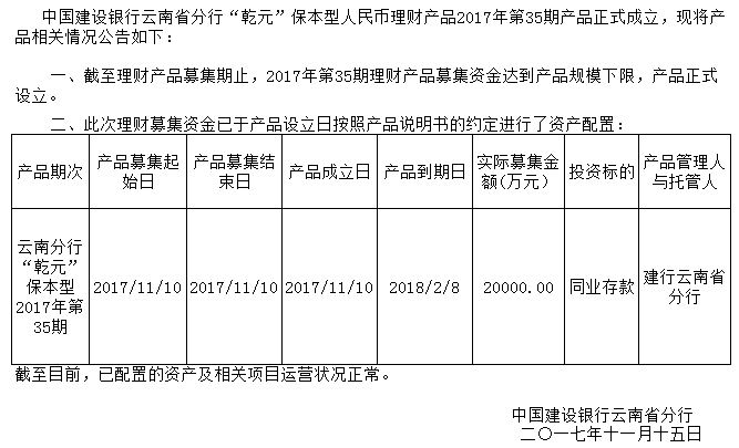 中国建设银行云南省分行“乾元”保本型人民币理财产品2017年第35期成立公告