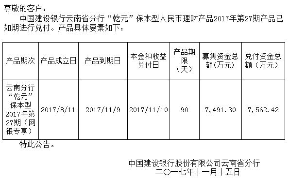 中国建设银行云南省分行“乾元”保本型人民币理财产品2017年27期兑付公告