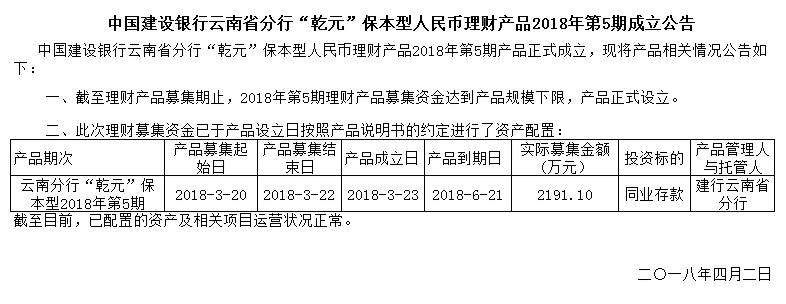 中国建设银行云南省分行“乾元”保本型人民币理财产品2018年第5期成立公告