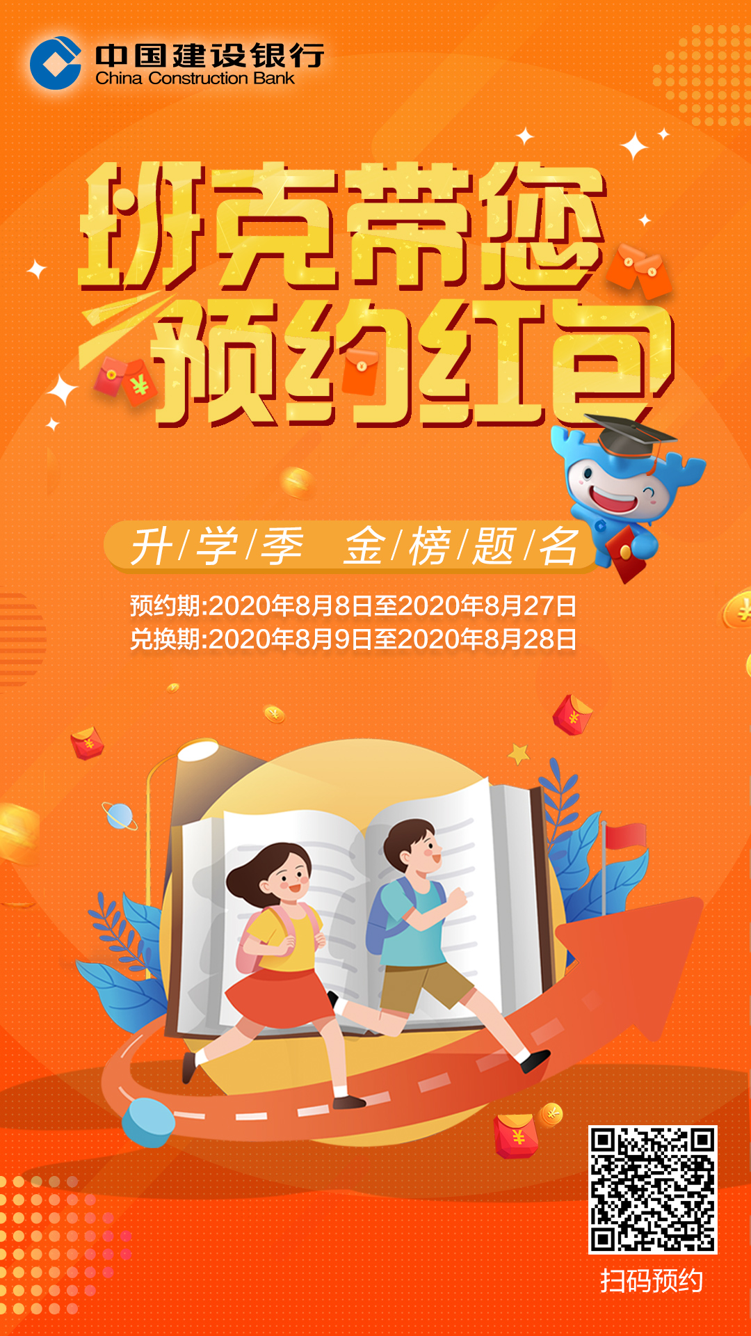 中国建设银行拟在2020年8月发行以升学季“金榜题名”为主题的现金红包产品,即新钞预约兑换。我行客户可通过手机银行、个人网银、移动门户,以及我行网点进行预约兑换新钞,现将有关事项公告如下: